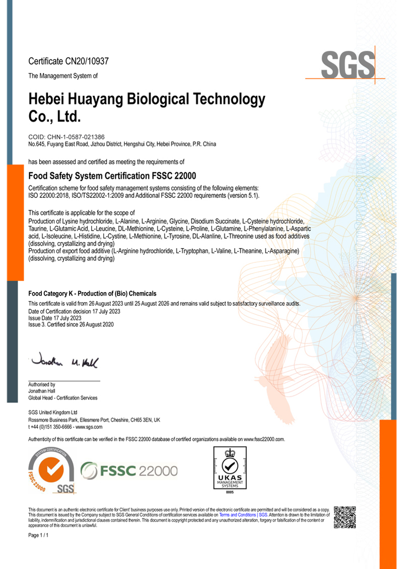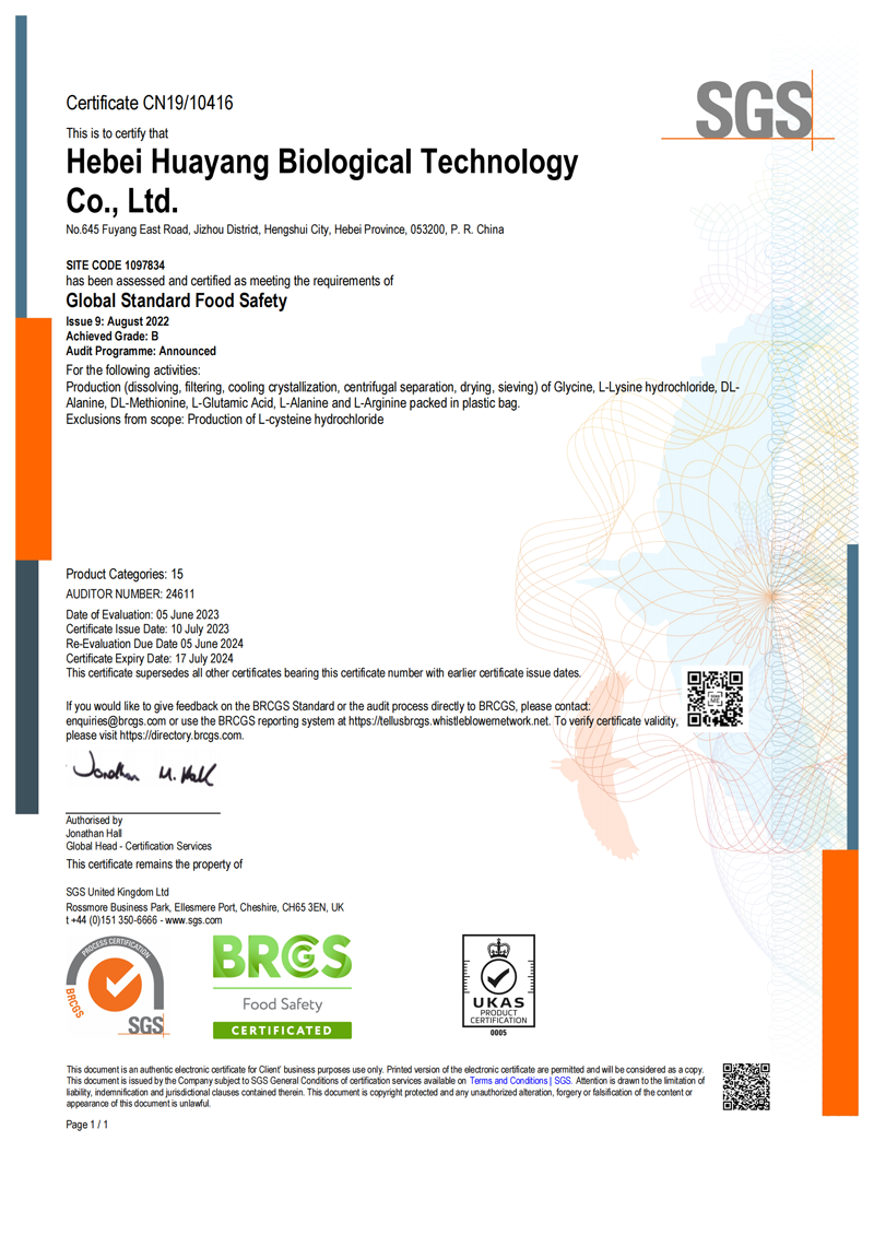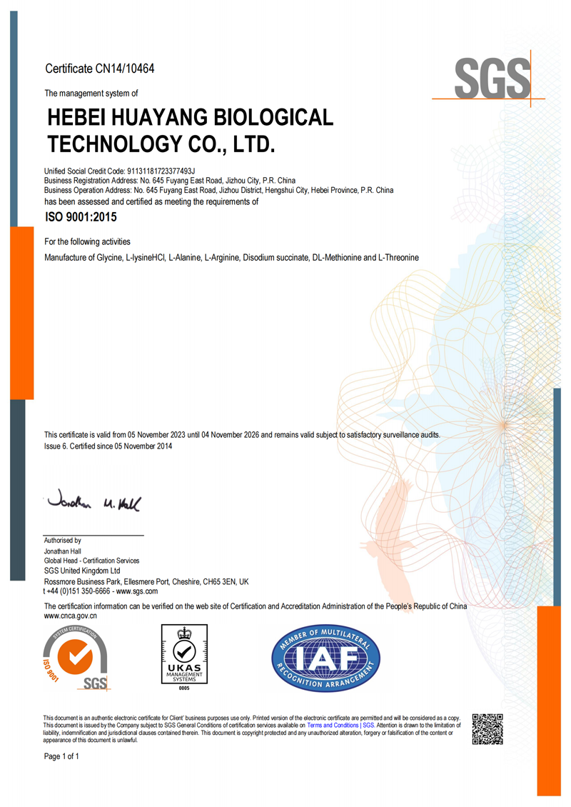 Hebei Huayang Group Co., Ltd. is located in the Provincial Industrial Park of Jizhou District, Hengshui City, Hebei Province (founded in 1987, formerly known as Jizhou Huayang Chemical Co., Ltd.). The group has four companies: Hebei Huayang Biological technology Co., Ltd., Hebei Huayue Amino Acid Technology Co., Ltd., Cangzhou Huachen Biological technology Co., Ltd., and Hengshui Yangli Trading Co., Ltd. Mainly produces industrial, food, amino acid series such as glycine, L-alanine, L-threonine, DL-methionine, L-lysine hydrochloride, L-cysteine hydrochloride, Disodium succinate. Products are widely used in food, beverage, feed industries.